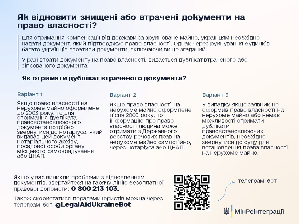 Міністерство з питань реінтеграції тимчасово окупованих територій України спільно з Міністерство юстиції України розробили інфографіку щодо порядку відновлення знищених або втрачених документів на право власності пошкодженого/зруйнованого житла.