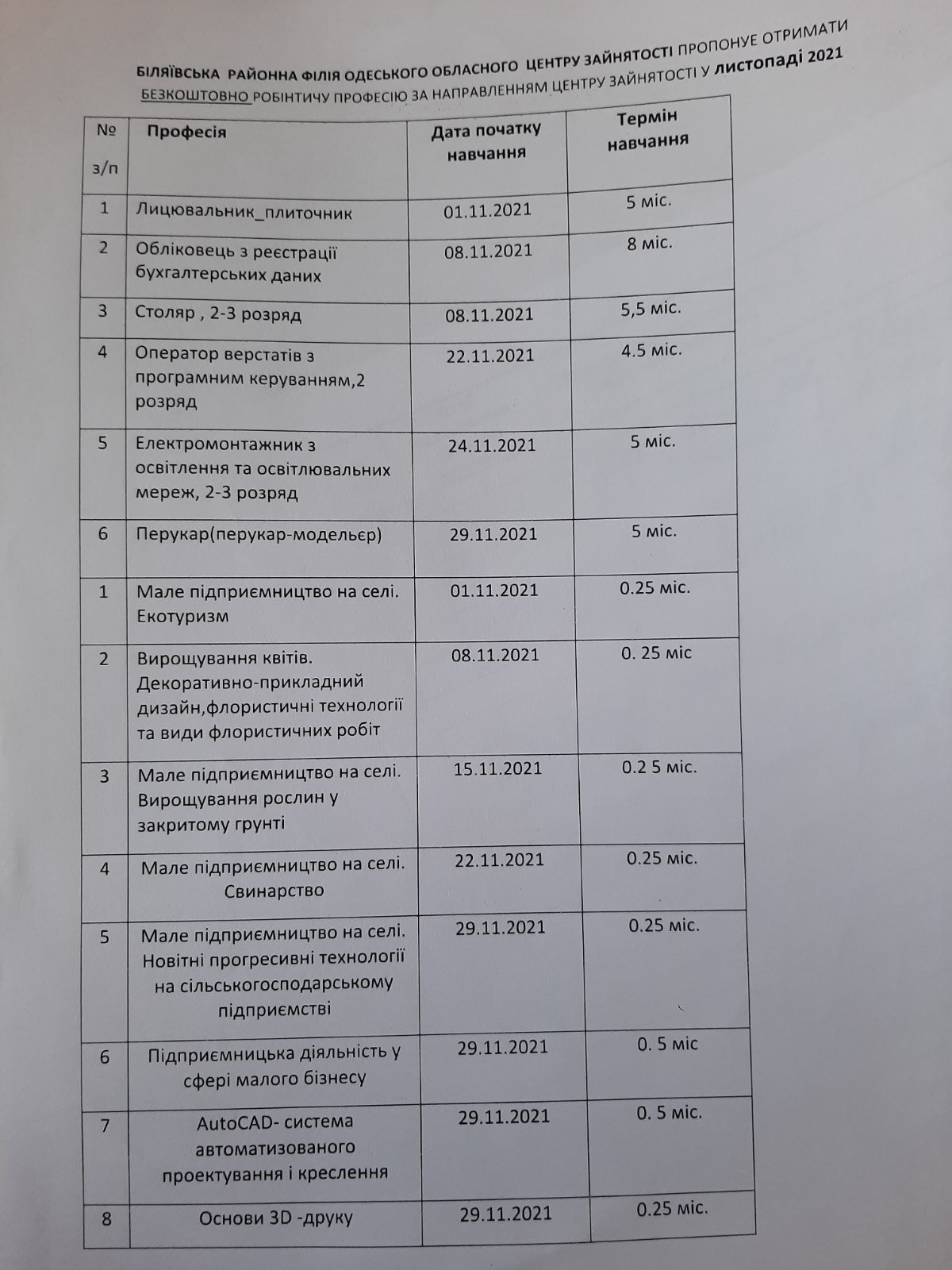 Біляївська районна філія Одеського обласного центру зайнятості пропонує отримати безкоштовно робітничу професію у листопаді 2021 р.