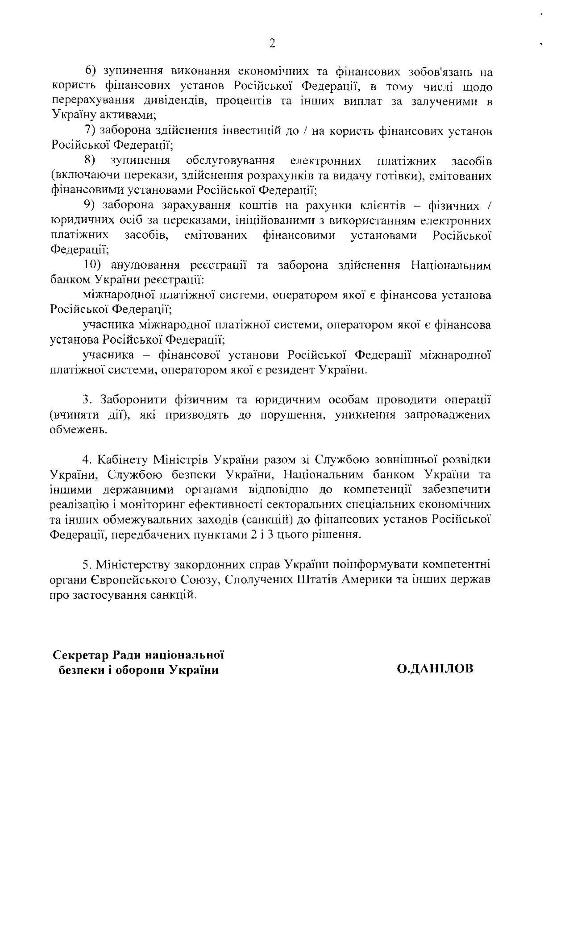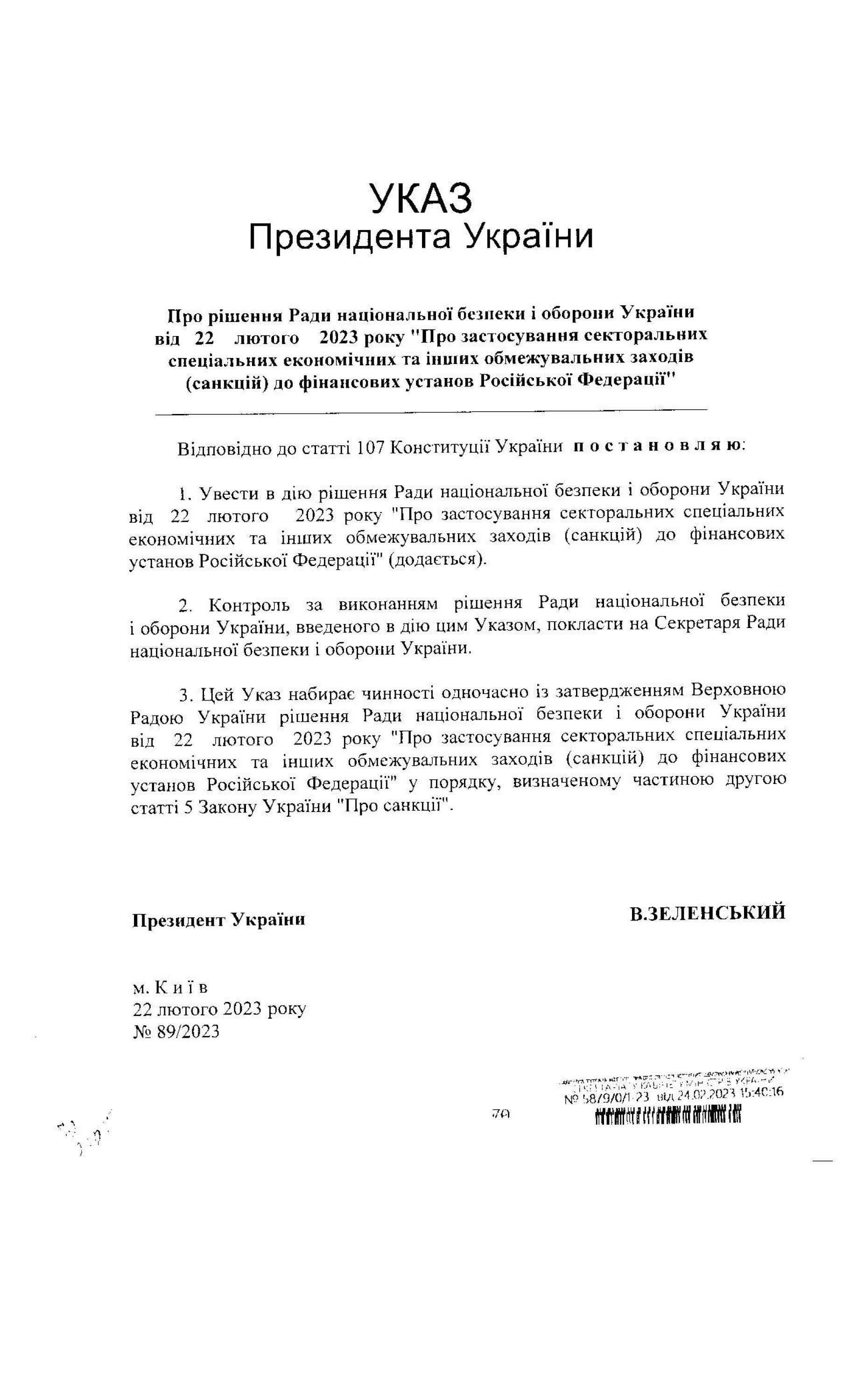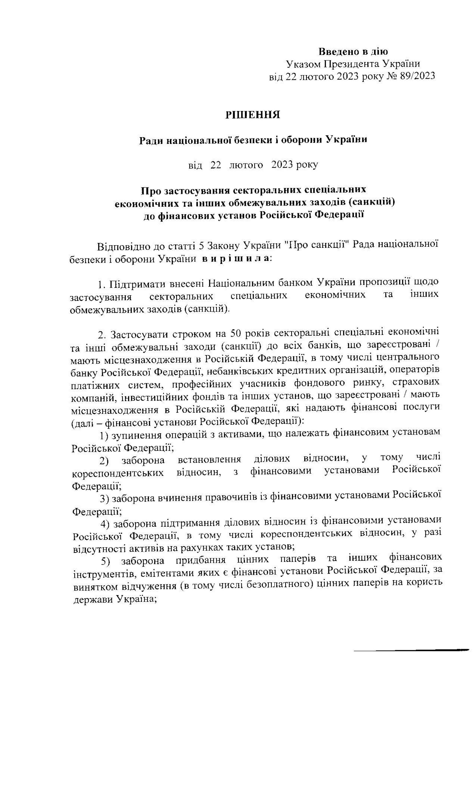 Про рішення Ради національної безпеки і оборони України від 22 лютого 2023 року «Про застосування секторальних спеціальних економічних та інших обмежувальних заходів (санкцій) до фінансових установ Російської Федерації».