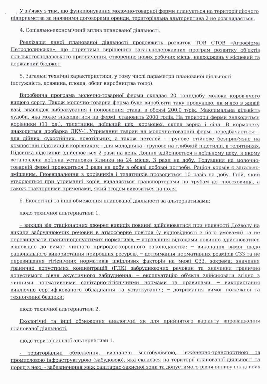 Про плановану діяльність ТОВ СТОВ «АГРОФІРМА ПЕТРОДОЛИНСЬКЕ» щодо функціонування молочно-товарної ферми ТОВ СТОВ «Агрофірма Петродолинське»