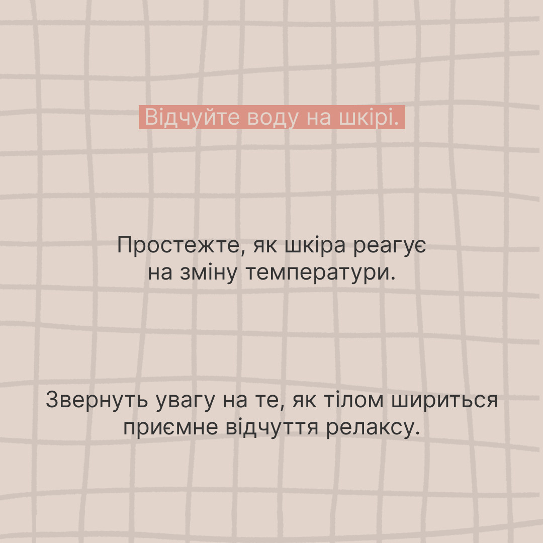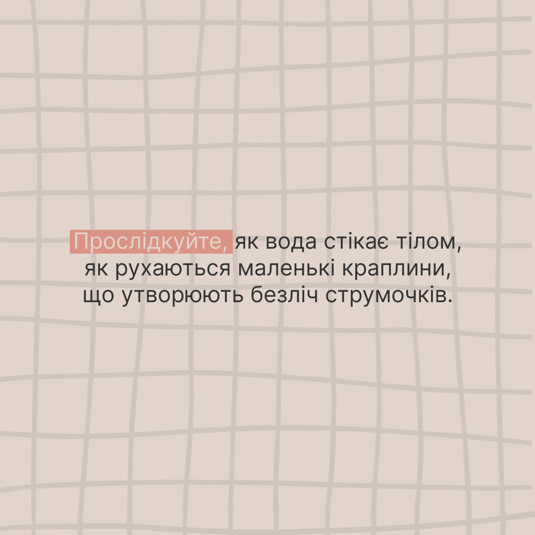 Пригадайте, ми вчилися усвідомлювати улюблену пісню, концентрувалися на ранковій каві. А тепер спробуємо тренінг усвідомленості просто в душі. Залиште поза кабінкою ваші думки — на ці 10-15 хвилин є тільки ви і лагідний струмінь води.