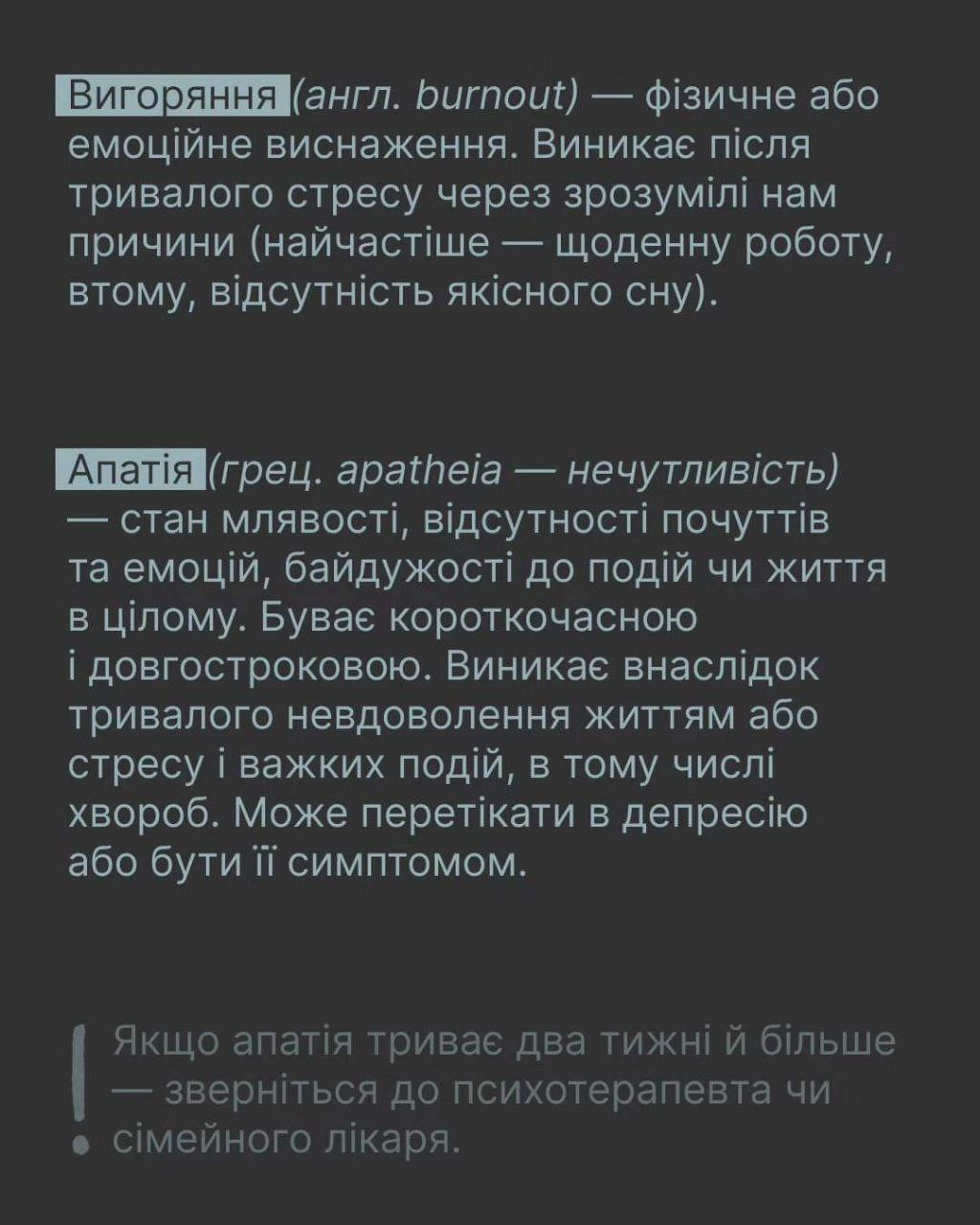 Гортаємо далі словник ментального здоров’я, аби краще орієнтуватися в темі та вміти вчасно й правильно піклуватися про себе.