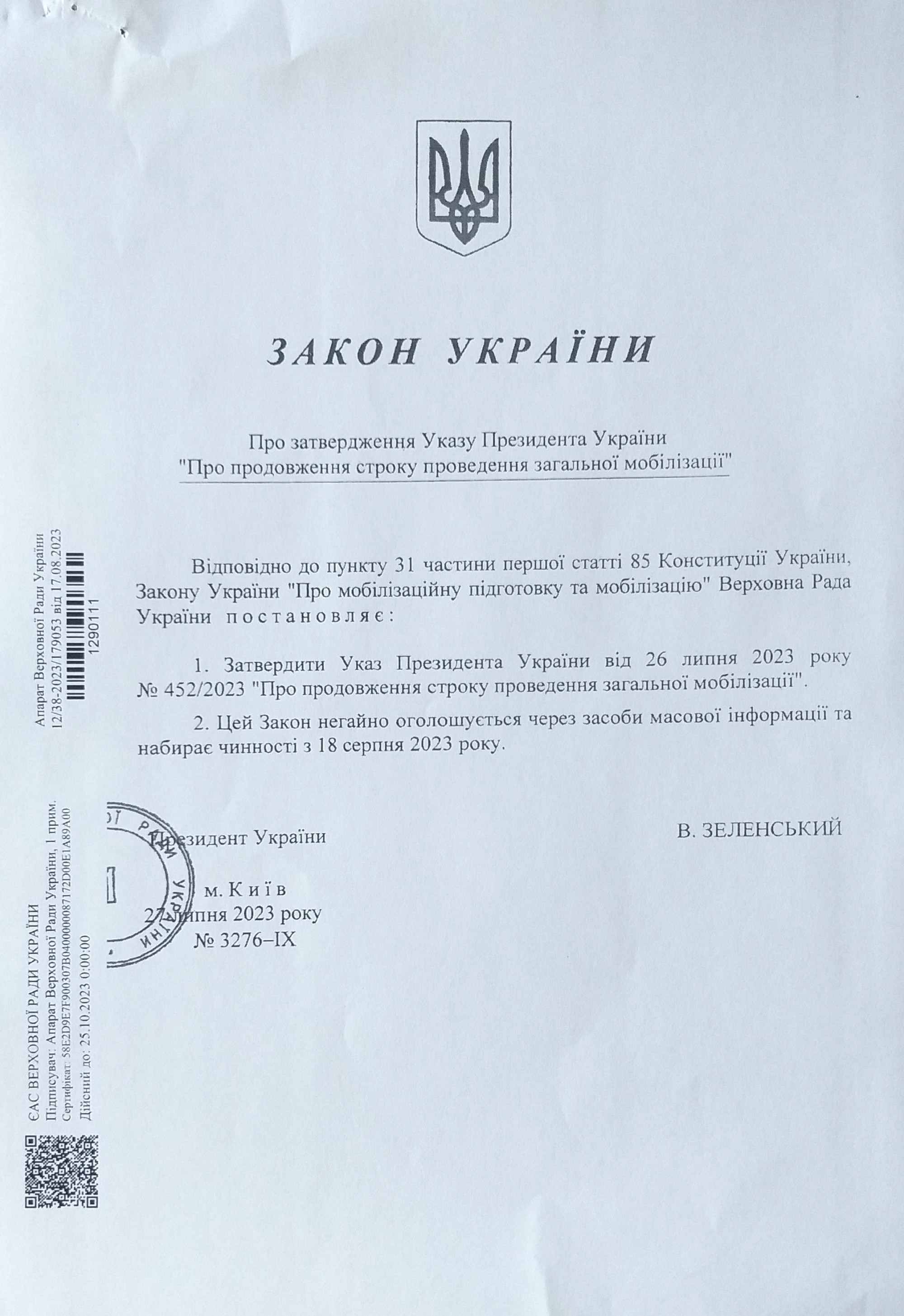Закон від 27.07.2023 р. №3276 "Про затвердження Указу Президента України "Про продовження строку проведення загальної мобілізації" (раніше законопроєкт №9533).