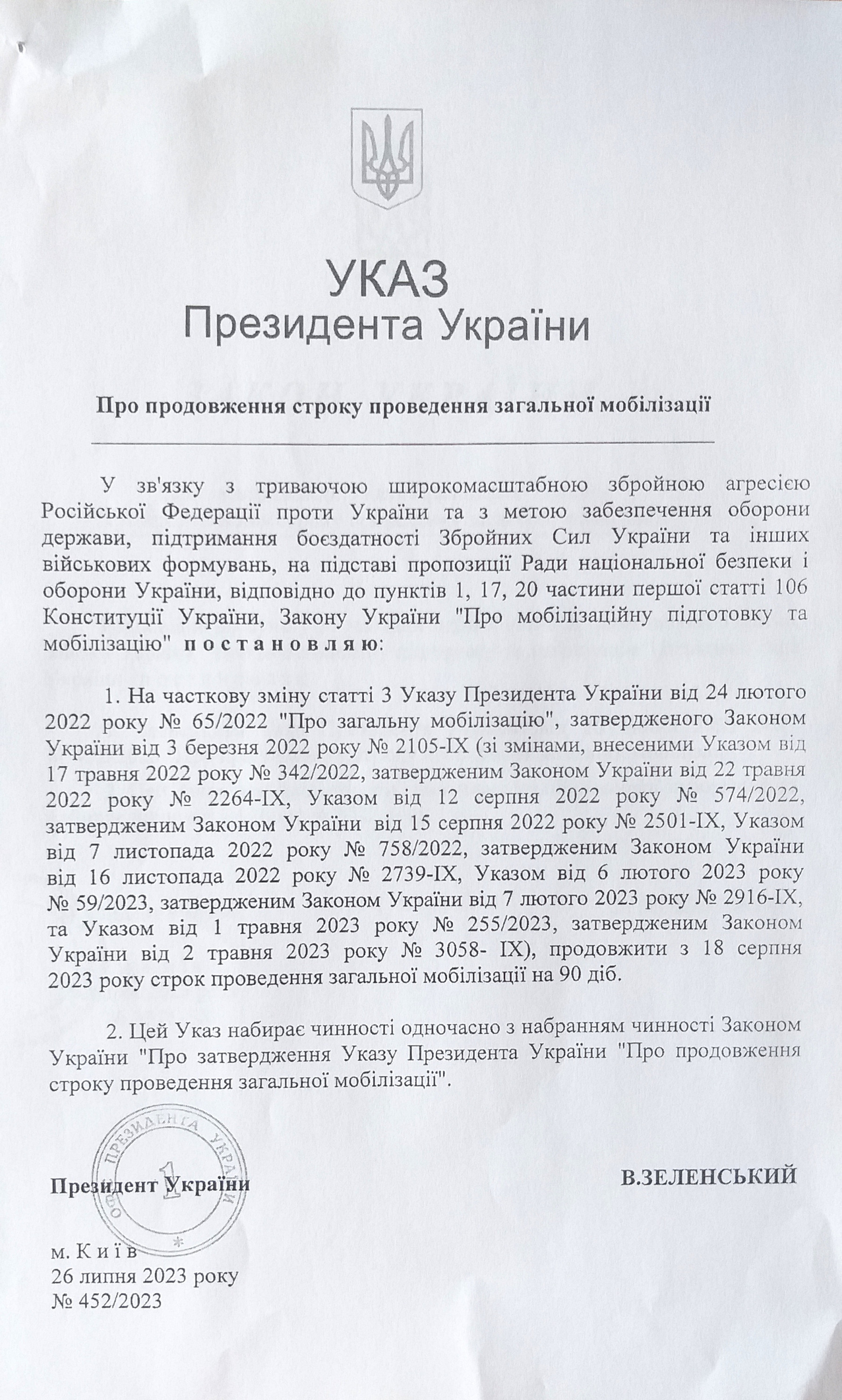 Сімнадцятого серпня опубліковано та набрали чинності закони та укази, якими продовжено воєнний стан та загальну мобілізацію з 18 серпня ще на 90 діб, тобто до 15 листопада 2023 року включно.