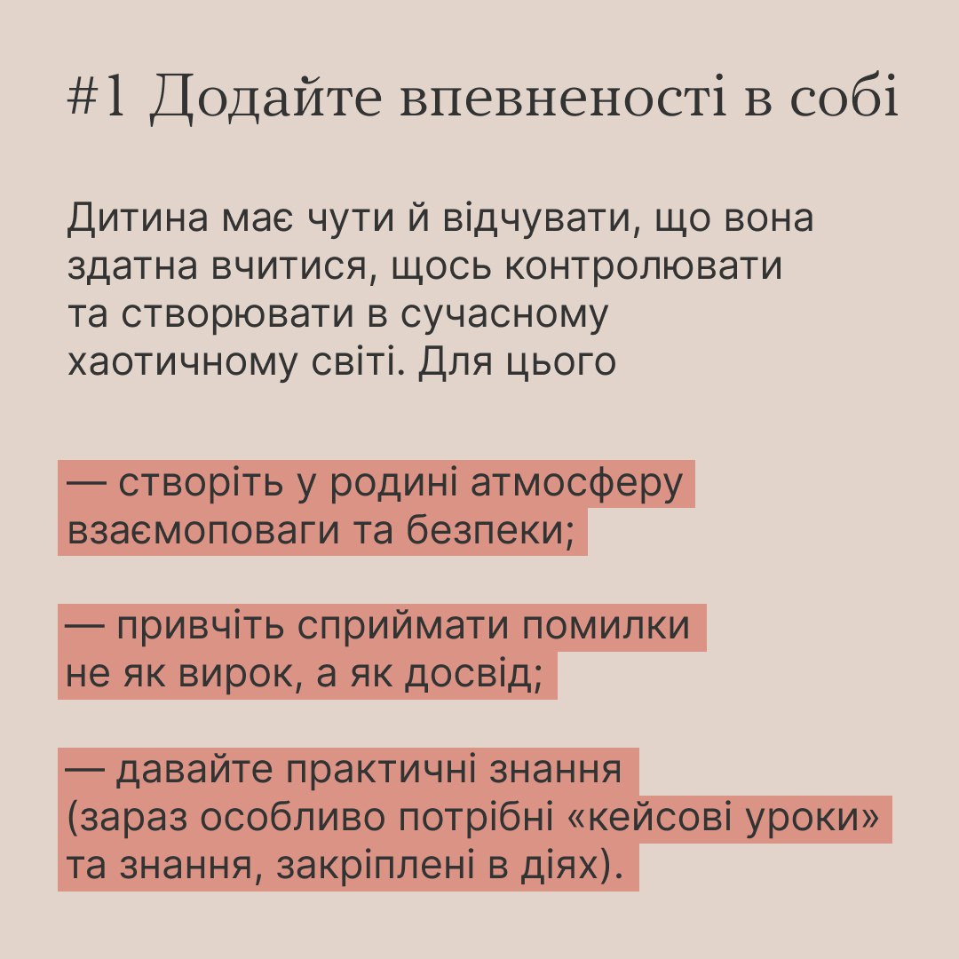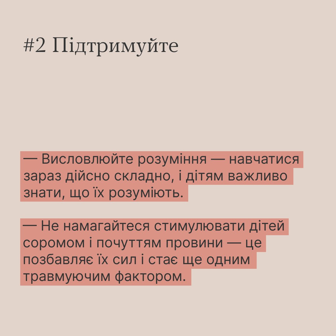 Психологиня Світлана Ройз радить насамперед створити для дітей простір безпеки та близькості поруч із дорослими. Турбуватися про їхню самооцінку, емоційний стан і бути готовими повсякчас підтримати.