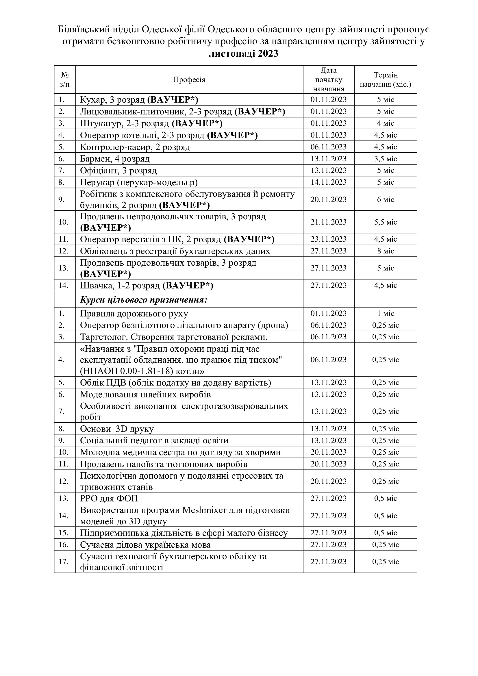 Біляївський відділ Одеської філії Одеського обласного центру зайнятості пропонує отримати безкоштовно робітничу професію за направленням центру зайнятості у листопаді 2023