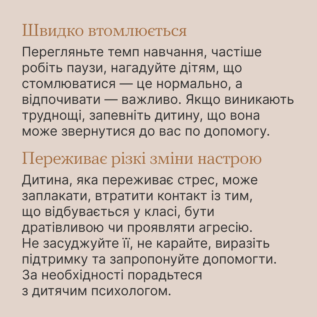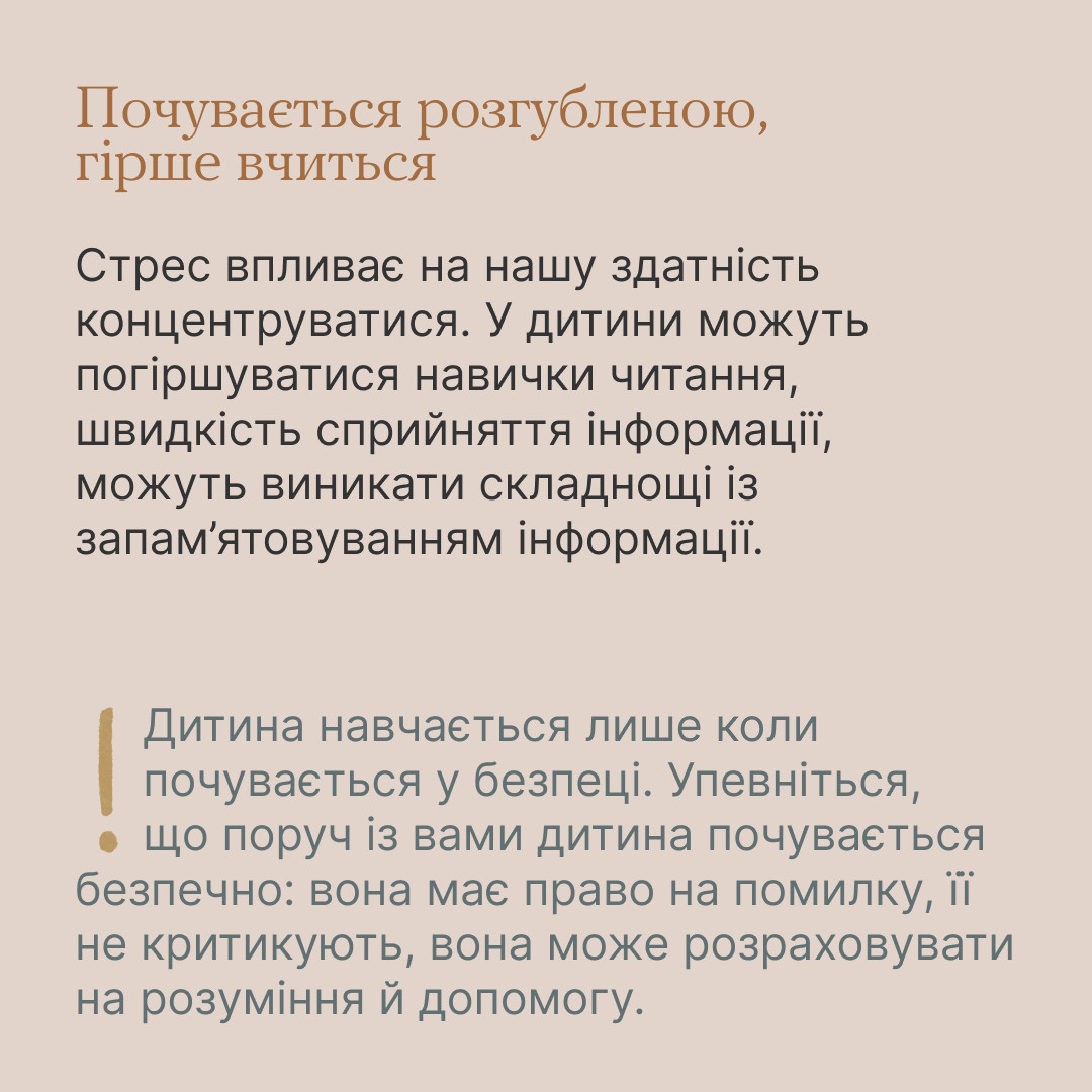 У період стресових подій зважайте на те, що здатність дитини навчатися може знижуватися: вона може гірше сприймати та запам’ятовувати нову інформацію, бути більш емоційною, менш зібраною та уважною.