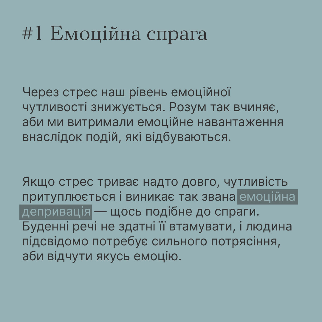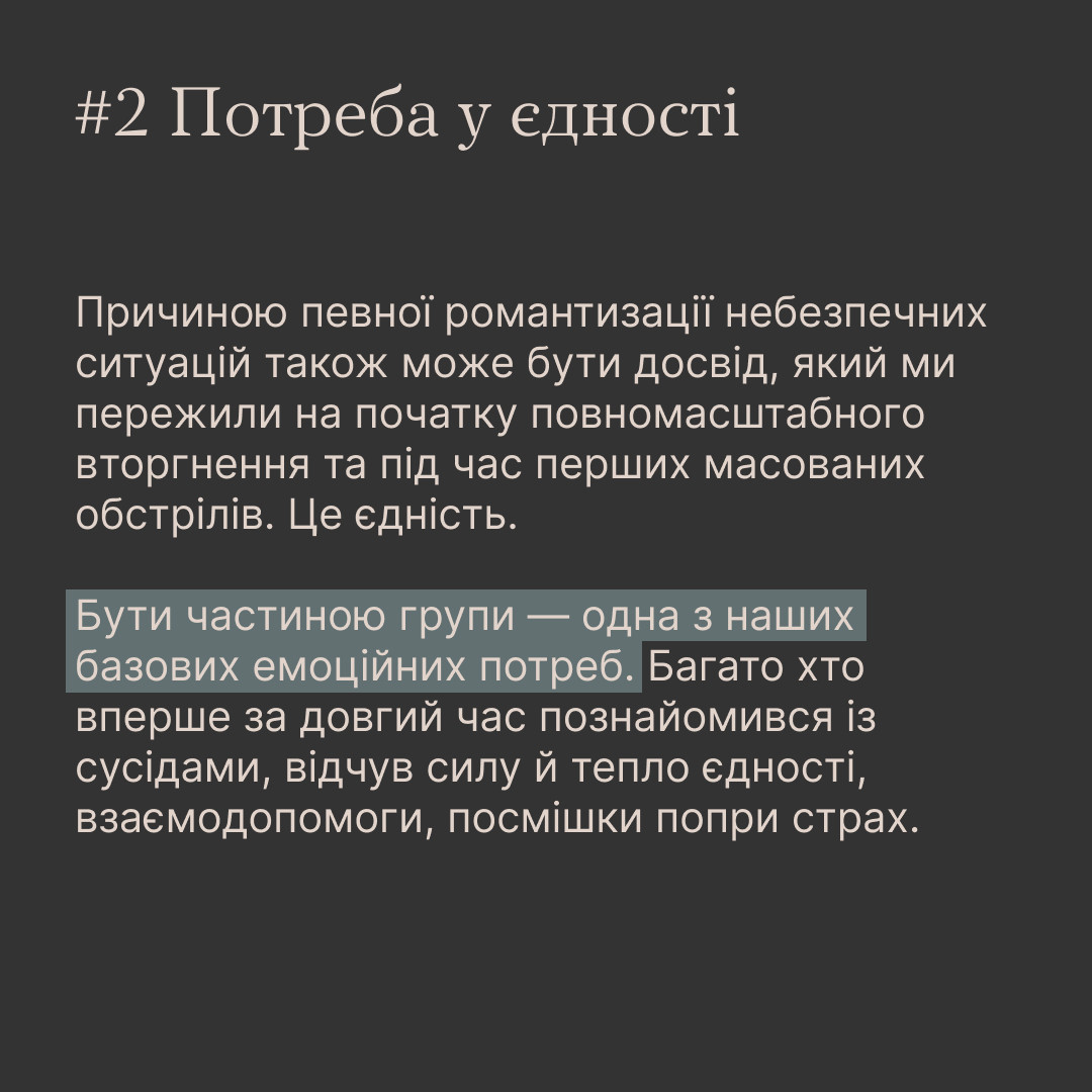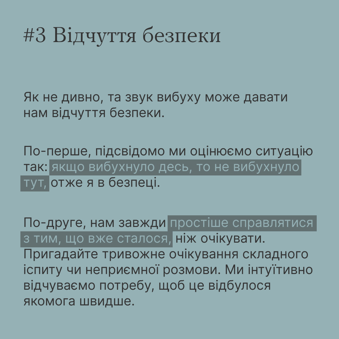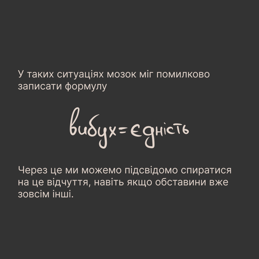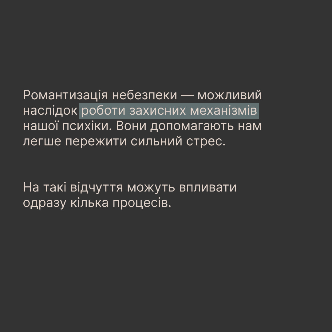 Під час повітряної тривоги ми можемо впіймати себе на моторошній думці, що чекаємо вибухів, а коли чуємо їх — ніби відчуваємо певне полегшення. Так само підсвідомо можемо романтизувати хвилини небезпеки, коли загроза минає — згадувати обстріли, час в укритті чи блекаути з певним теплом, і це лякає ![]()