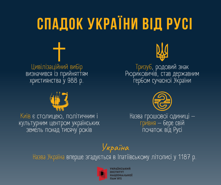 Спадком Русі є герб (тризуб), грошова одиниця, а, головне, Київ як політичний і культурний центр України.