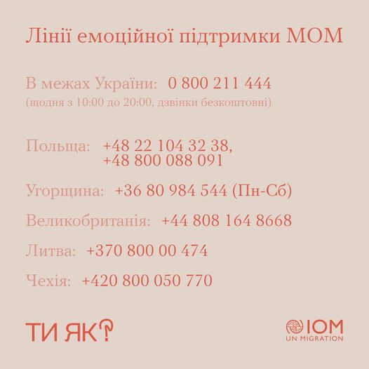 Лінія емоційної підтримки Міжнародної організації з міграції (МОМ) — це безкоштовна та анонімна допомога кваліфікованих психологів, які готові вислухати вас при будь-яких запитах для покращення емоційного стану.