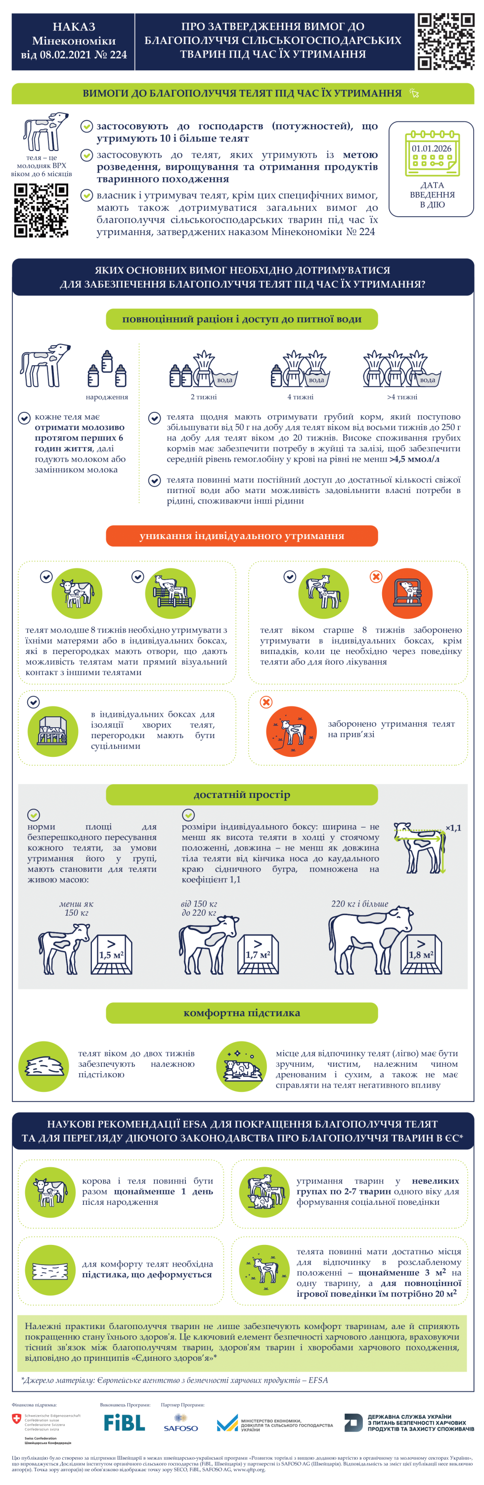 За підтримки Швейцарії, в межах швейцарсько-української програми «Розвиток торгівлі з вищою доданою вартістю в органічному та молочному секторах України» (Quality FOOD Trade Program), що впроваджується Дослідним інститутом органічного сільського господарства (FiBL, Швейцарія) у партнерстві з SAFOSO AG (Швейцарія), Міністерством економіки, довкілля та сільського господарства України та Держпродспоживслужбою, створено інфографіку, в якій висвітлені вимоги до благополуччя телят під час їх утримання.