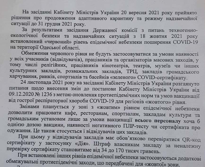 ОДА інформує: робота закладів у "жовтій" зоні без перевірки у відвідувачів сертифікату вакцинації загрожє штрафом!