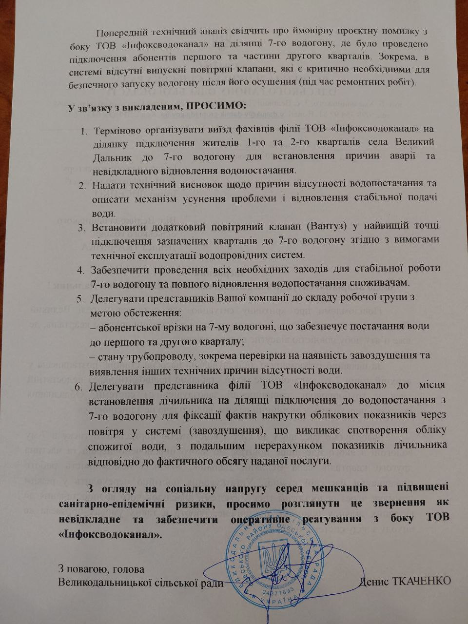 ▪️ Надіслано звернення до ТОВ "Інфоксводоканал" з вимогою забезпечити виїзд технічних фахівців і відновити тиск у 7-му водогоні.
