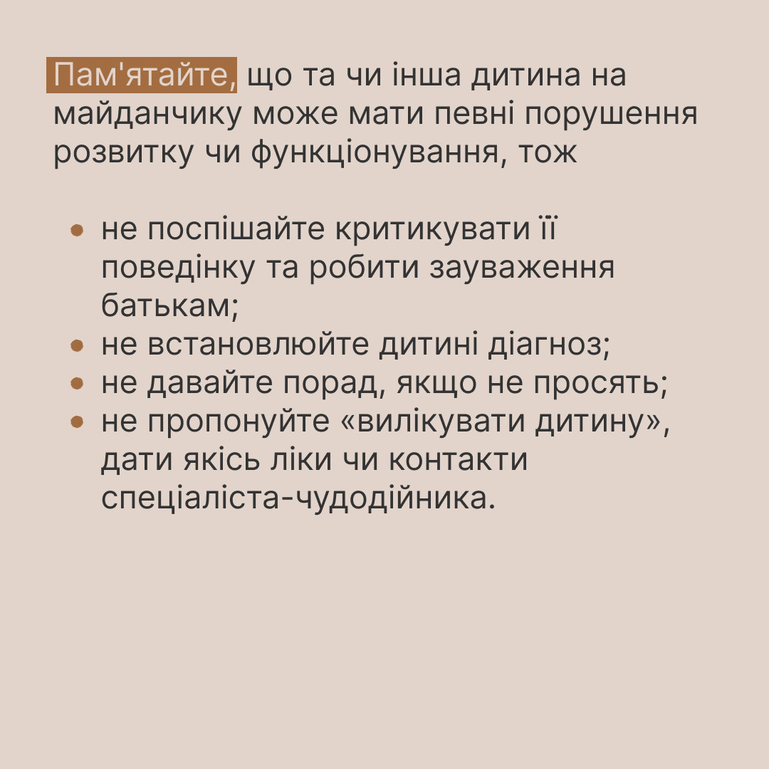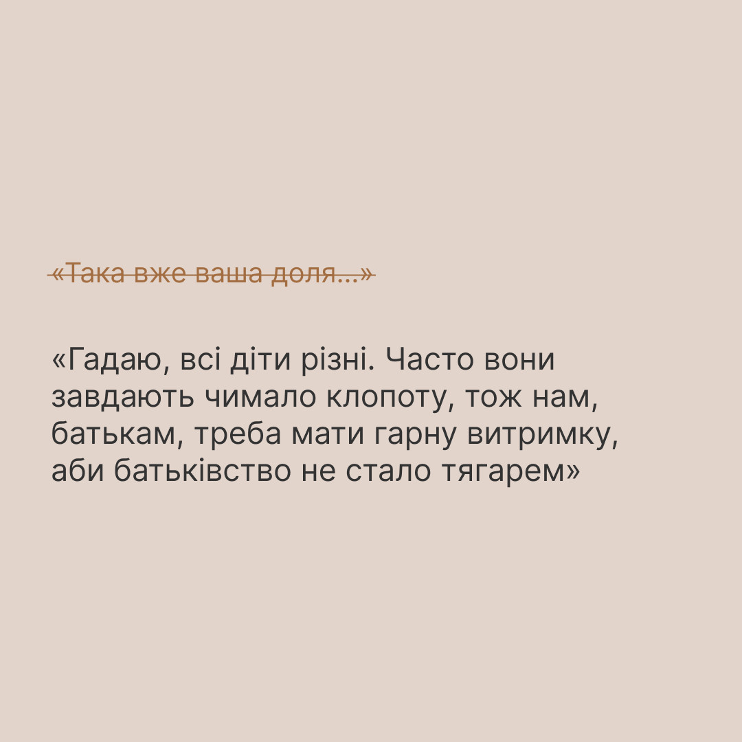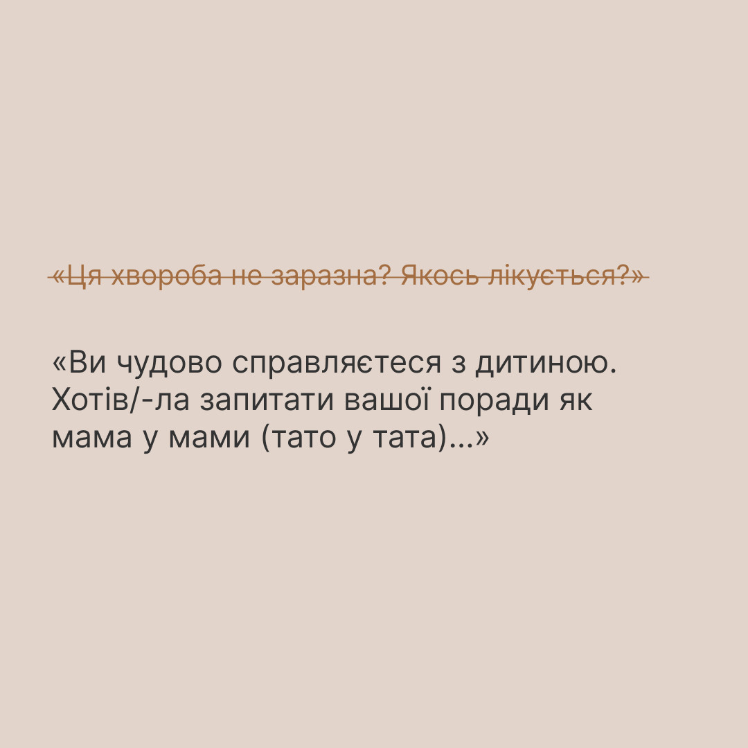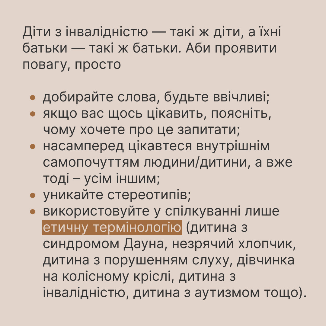 Пам’ятаймо, що батьки дітей з інвалідністю не потребують особливого ставлення чи специфічного спілкування. Вони такі ж батьки, як усі інші.
