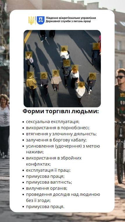 Південне міжрегіональне управління Державної служби з питань праці інформує щодо форм торгівлі людьми.