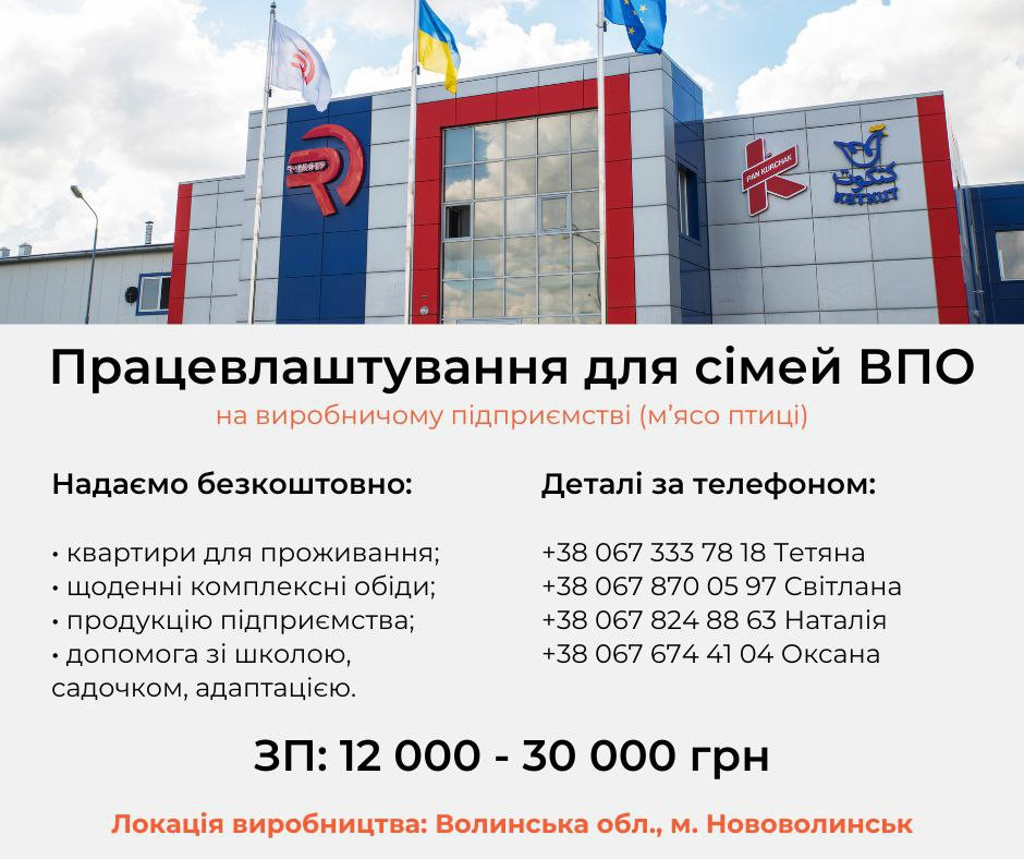 Пропонуємо сім’ям ВПО працевлаштування на нашому підприємстві за адресою Волинська обл., м. Нововолинськ та надаємо безоплатно квартири для проживання та безоплатне харчування.