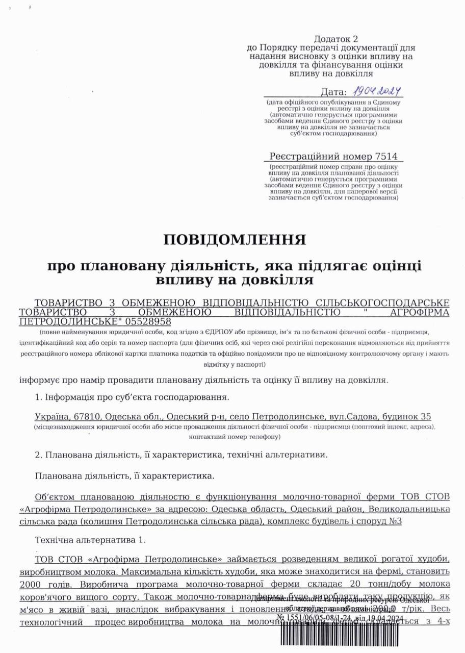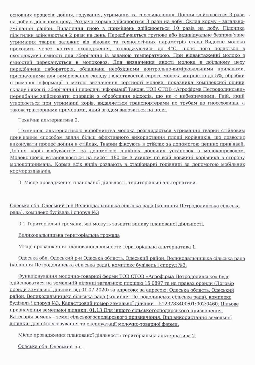 Про плановану діяльність ТОВ СТОВ «АГРОФІРМА ПЕТРОДОЛИНСЬКЕ» щодо функціонування молочно-товарної ферми ТОВ СТОВ «Агрофірма Петродолинське»