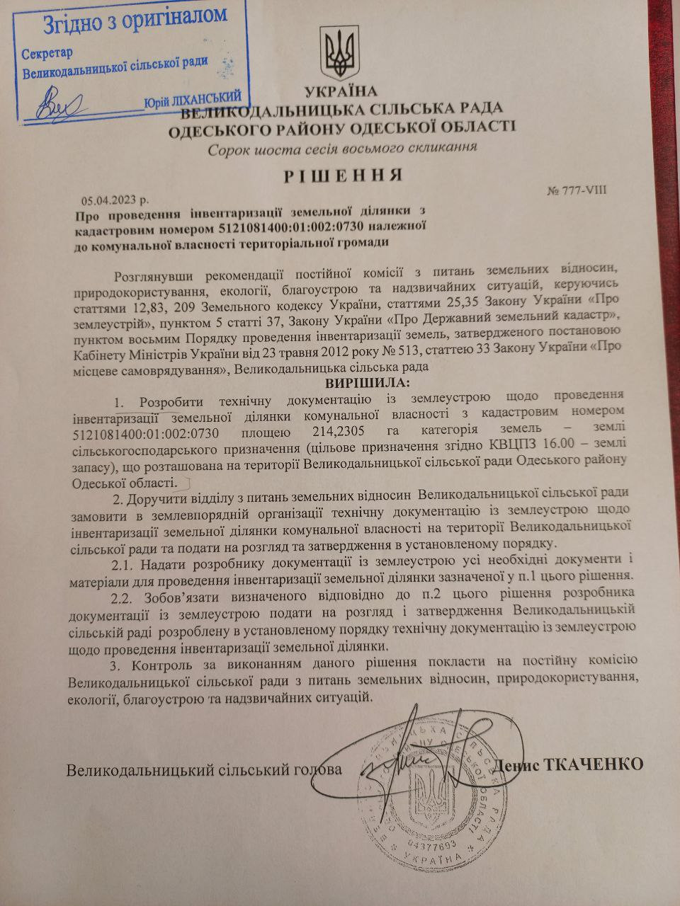 46-а сесія VIII скликання Великодальницької сільської ради Одеського району одеської області прийняло рішення №777-VIII «Про проведення інвентаризації земельної ділянки з кадастровим номером 5121081400:01:002:0730 належної до комунальної власності територіальної громади»