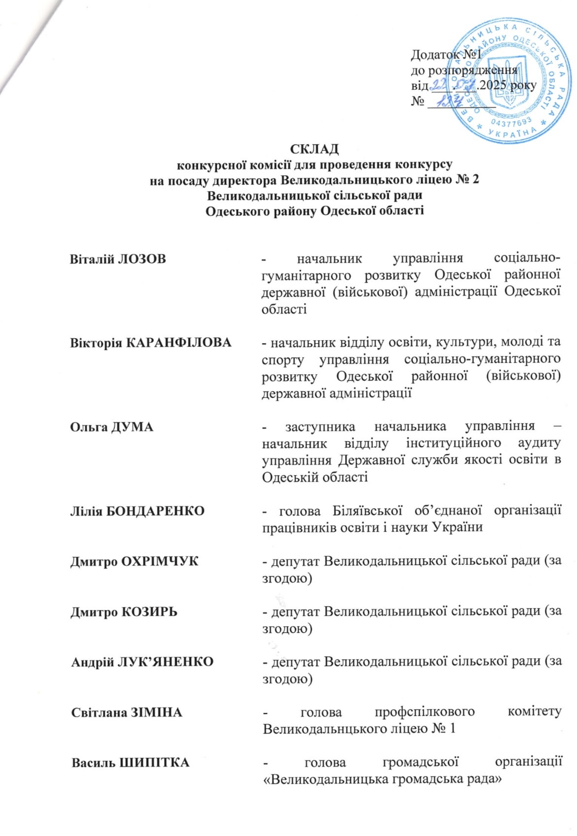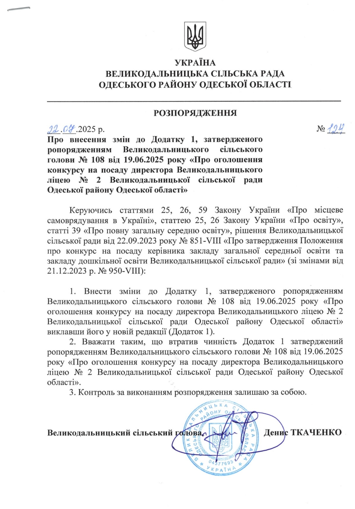 Про внесення змін до Додатку 1, затвердженого опорядженням Великодальницького сільського олови Nº 108 від 19.06.2025 року