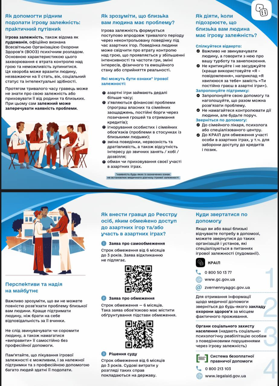 Комісією з регулювання азартних ігор та лотарей розроблено практичний путівник, який стане корисним інструментом для тих, хто прагне допомогти своїм близьким подолати ігрову залежність, а також сприяє інформуванню громадськості про наявні способи підтримки.