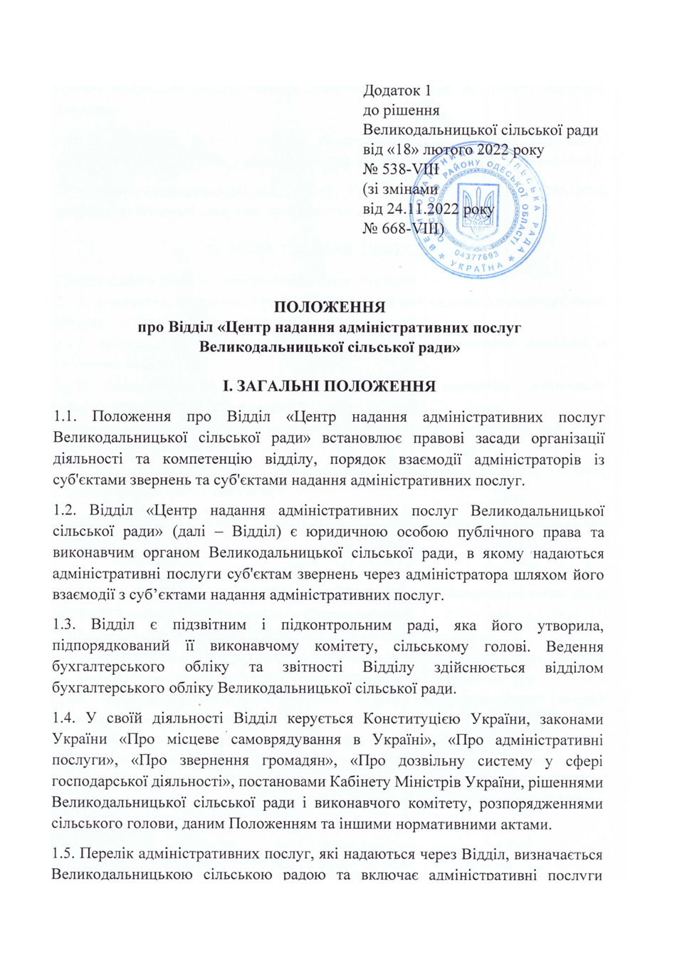 Рішення від 24.11.2022 № 668-VIII «Положення про Відділ "Центр надання адміністративних послуг Великодальницької сільської ради"»