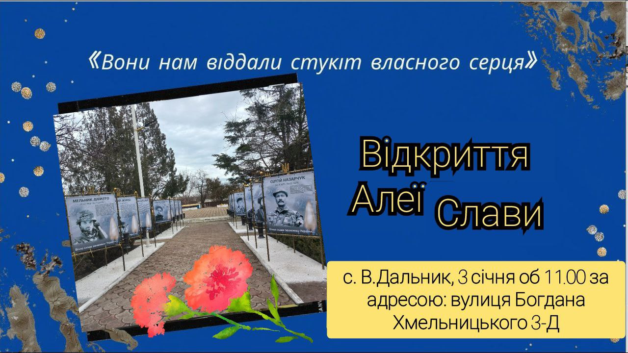 3 січня об 11.00 год. в с. Великий Дальник за адресою: вул. Б. Хмельницького 3-Д (меморіал пам'яті в центрі), відбудеться урочисте відкриття Алеї Слави та пам’яті на честь загиблих Героїв громади полеглих під час повномасштабного вторгнення, що поклали своє життя за волю та світле майбутнє нашої України.