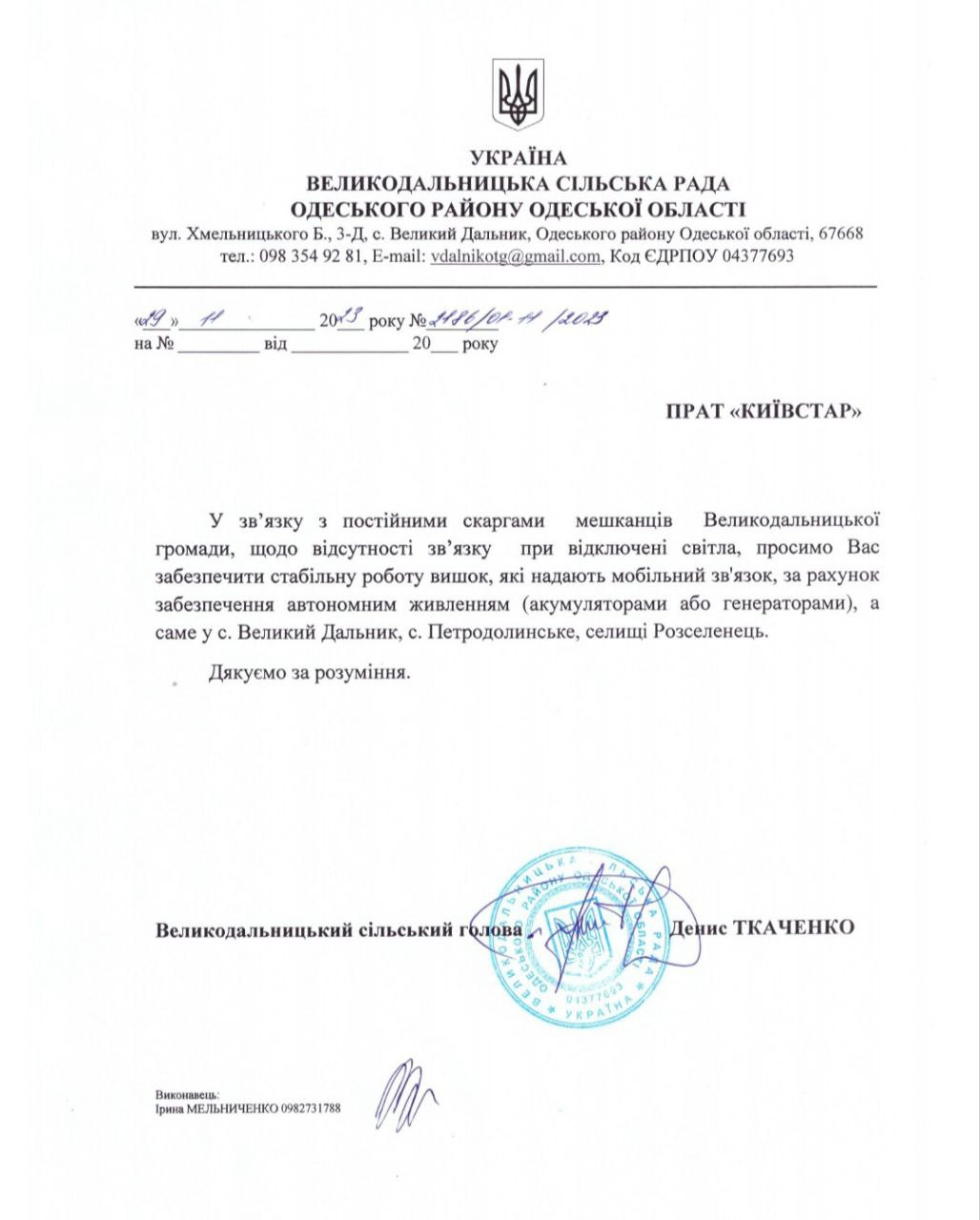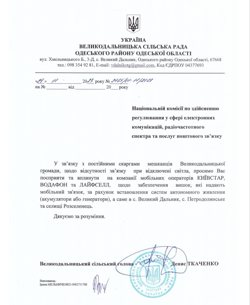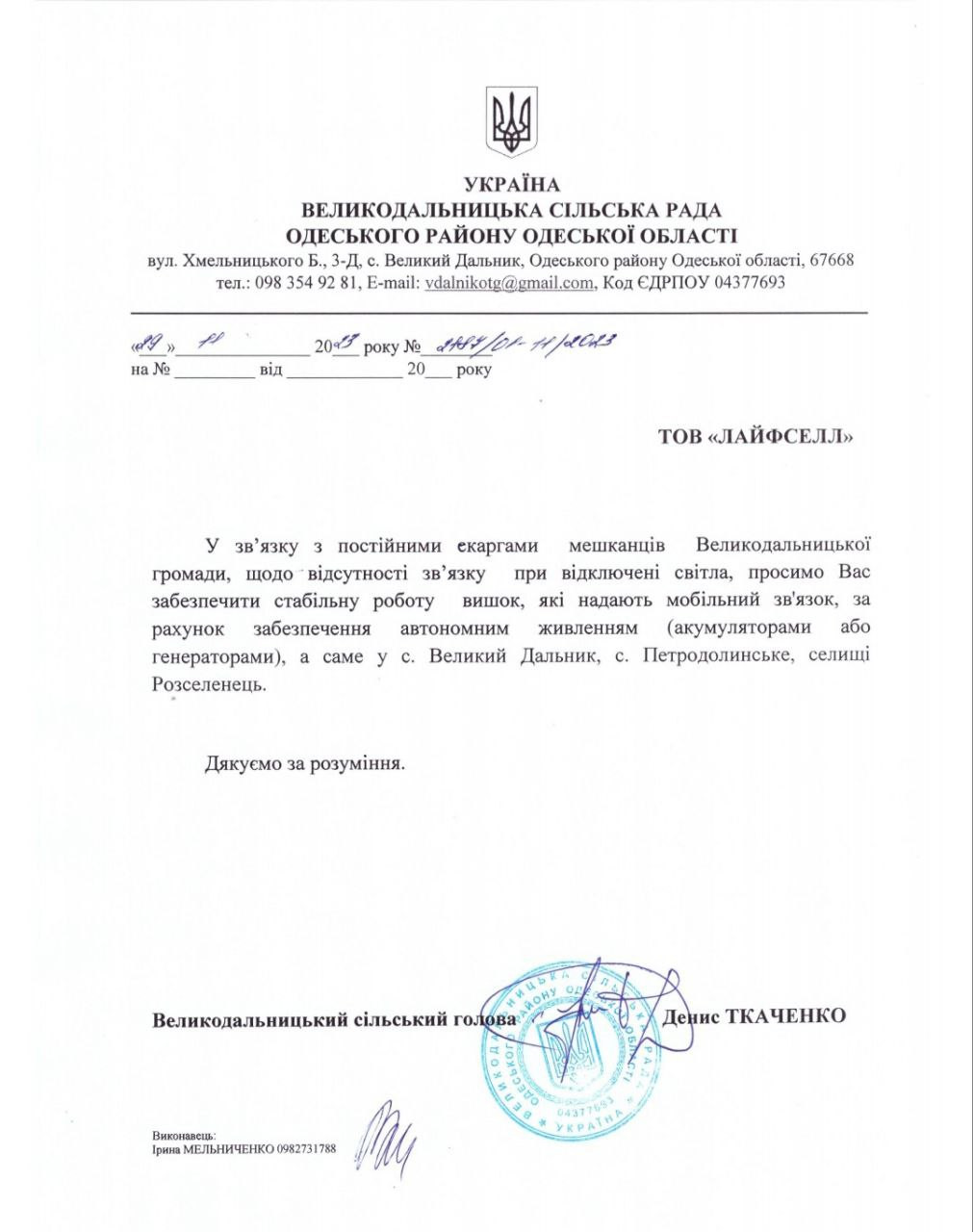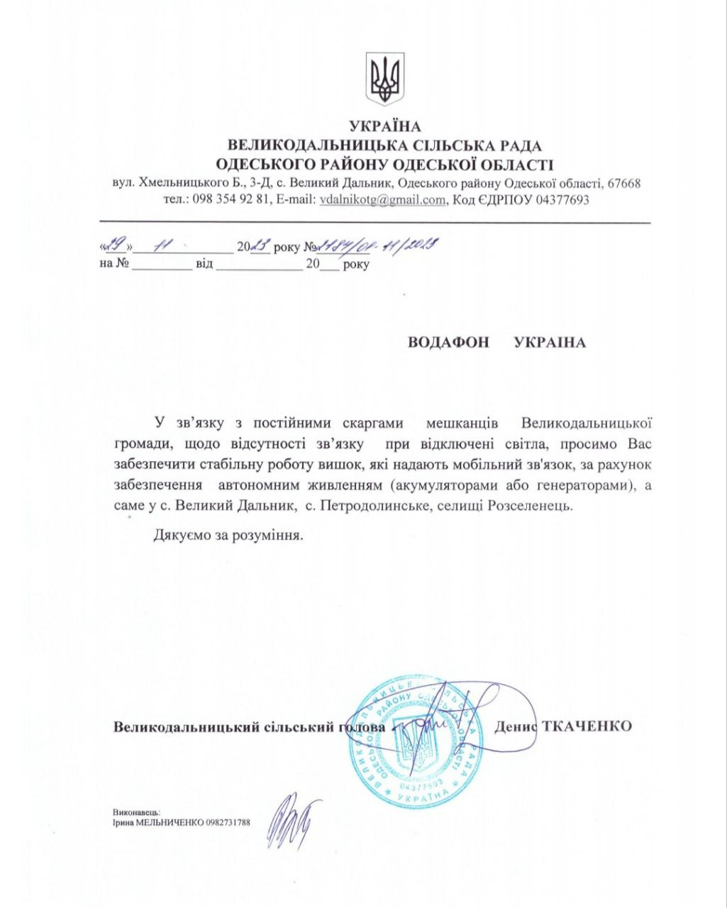 Водночас Великодальницька сільська рада направила листи до компаній: Київстар, Лайф та Вудафон з проханням встановити альтернативні джерела живлення (акамулятори або генератори) та скаргу до НАЦІОНАЛЬНА КОМІСІЯ, ЩО ЗДІЙСНЮЄ ДЕРЖАВНЕ РЕГУЛЮВАННЯ У СФЕРАХ ЕЛЕКТРОННИХ КОМУНІКАЦІЙ, РАДІОЧАСТОТНОГО СПЕКТРА на операторів мобільного ринку.