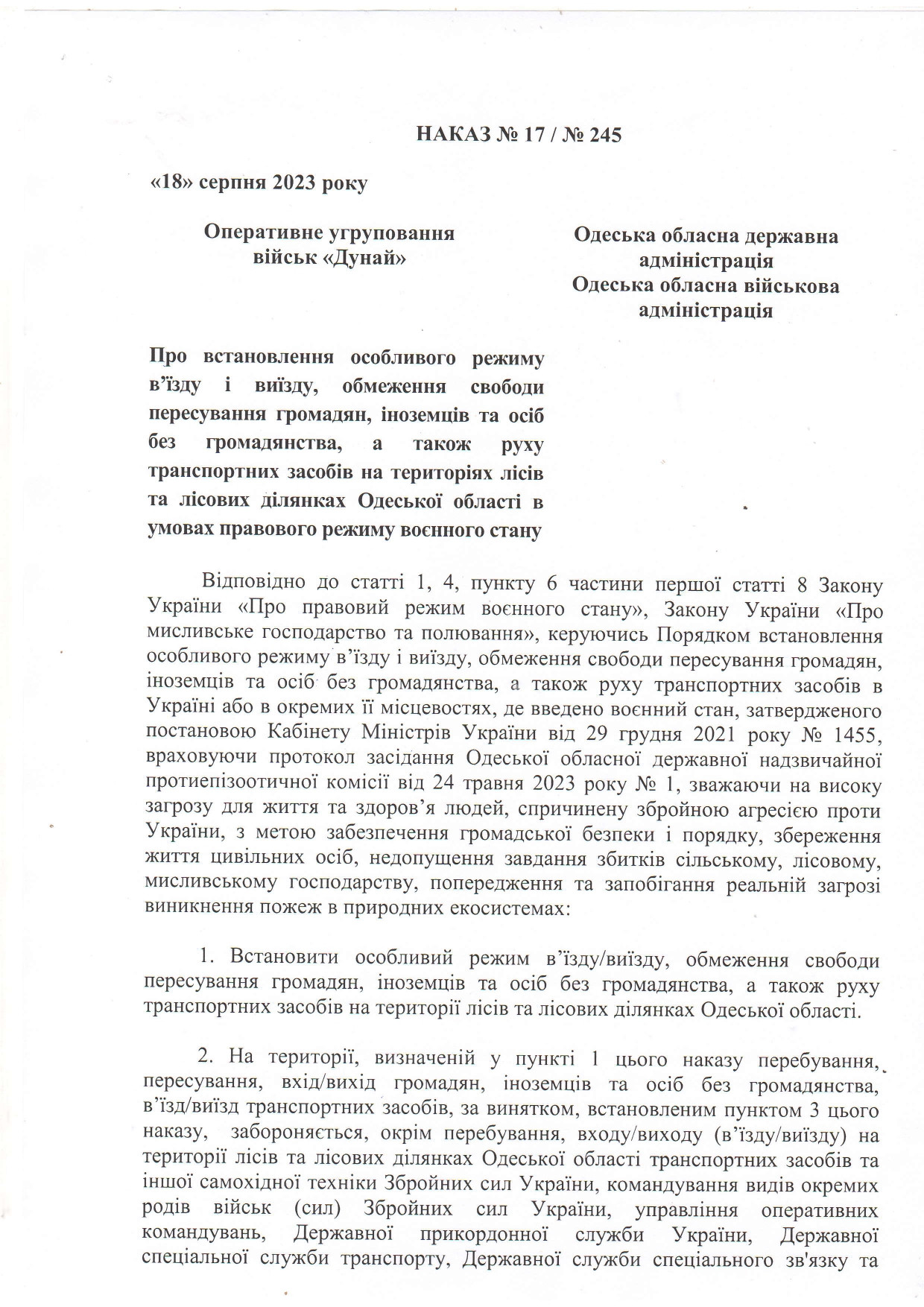 Розпорядження начальника Одеської районної державної (військової) адміністрації від 23 жовтня 2023 № 167/од2023 «Про виконання наказу від 16 жовтня 2023 року №30 «Про встановлення особливого режиму в’їзду і виїзду, обмеження свободи пересування громадян, іноземців та осіб без громадянства, а також руху транспортних засобів на окремих територіях Одеської області в умовах правового режиму воєнного стану», Наказ начальника Одеської обласної військової адміністрації та командувача оперативно-стратегічного угруповання військ «Одеса» від 16 жовтня 2023 року № 30 «Про встановлення особливого режиму в’їзду і виїзду, обмеження свободи пересування громадян, іноземців та осіб без громадянства, а також руху транспортних засобів на окремих територіях Одеської області в умовах правового режиму воєнного стану».