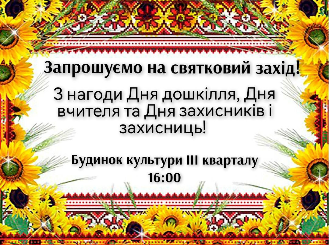 1 жовтня о 16:00 у Будинку культури ІІІ кварталу відбудеться урочистий захід та концерт з нагоди Днів освітян та Дня захисників і захисниць.