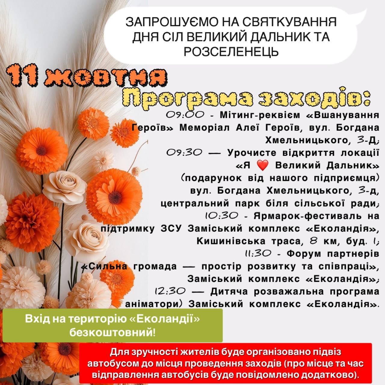 ЗАПРОШУЄМО НА СВЯТКУВАННЯ ДНЯ СІЛ ВЕЛИКИЙ ДАЛЬНИК ТА РОЗСЕЛЕНЕЦЬ!